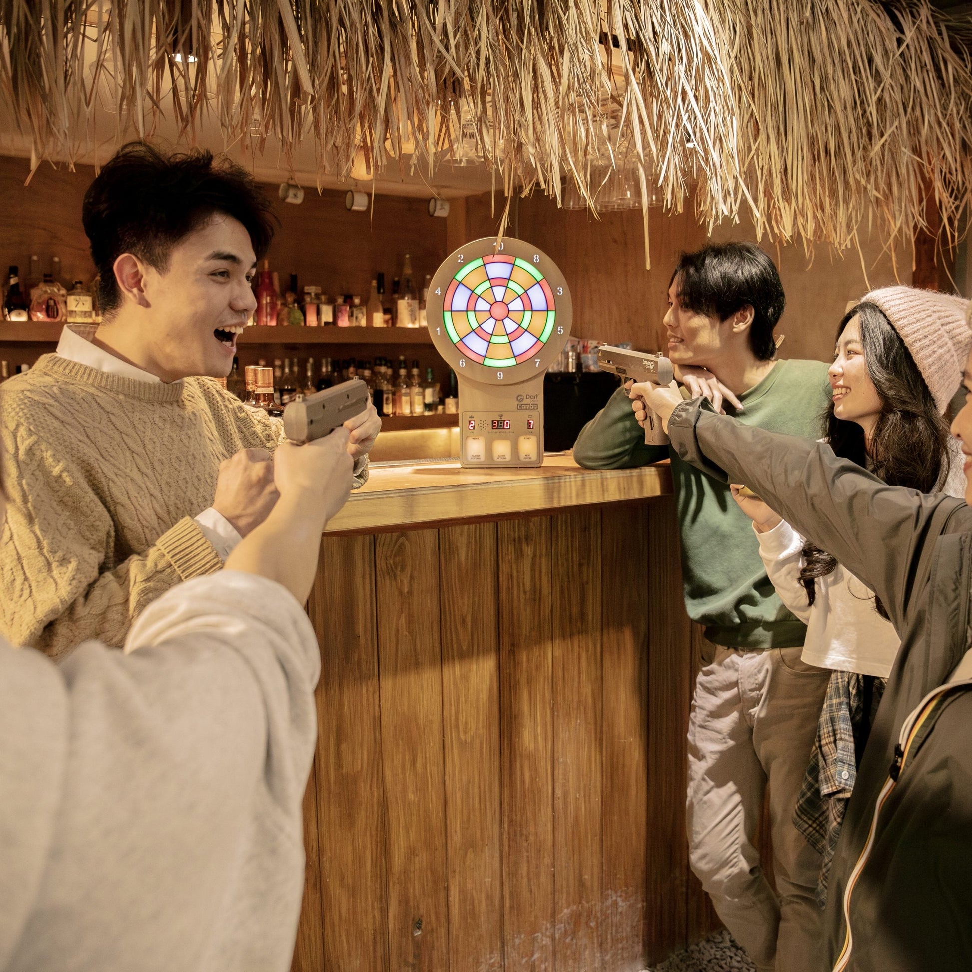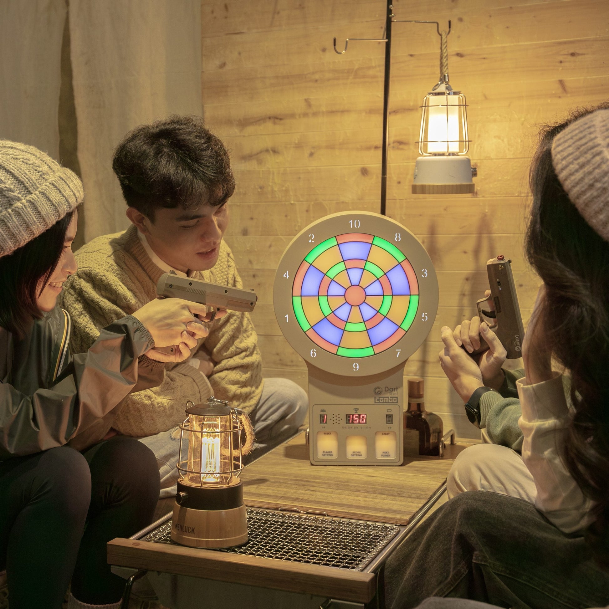 Adjust the game settings, and of course, show off with the laser gun! Just shoot the panel below the DartShot Combo to select the target score and number of players, then start the competition.